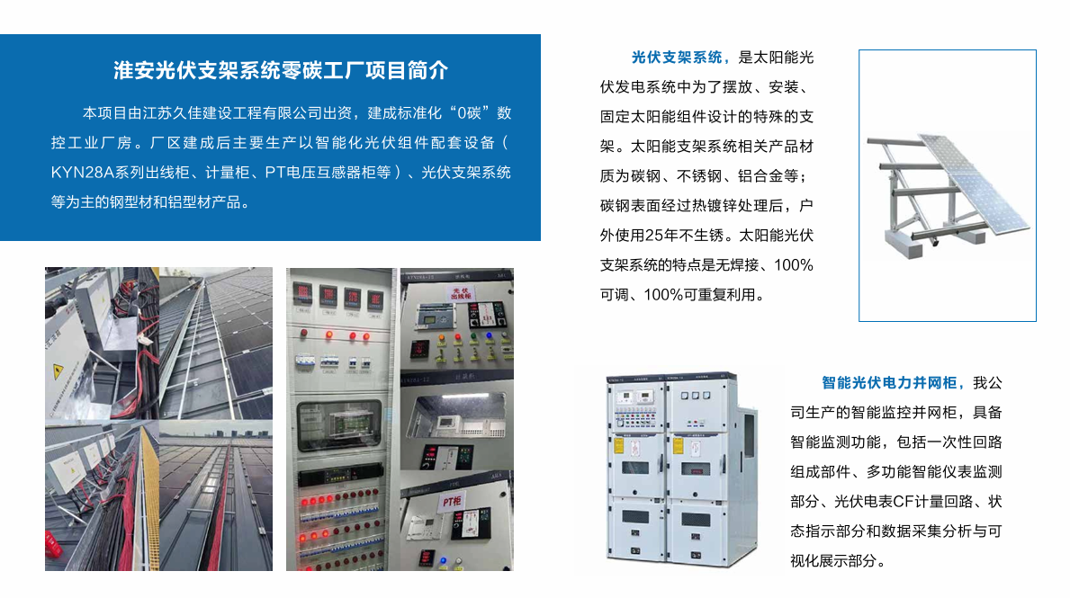 本項目由江蘇久佳建設工程有限公司出資,建成標準化“0碳”數控工業廠房。廠區建成后主要生產以智能化光伏組件配套設備(KYN28A系列出線柜、計量柜、PT電壓互感器柜等)、光......
